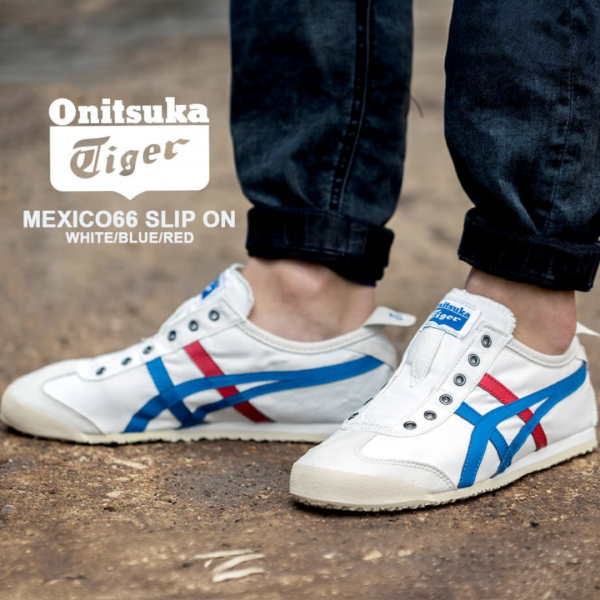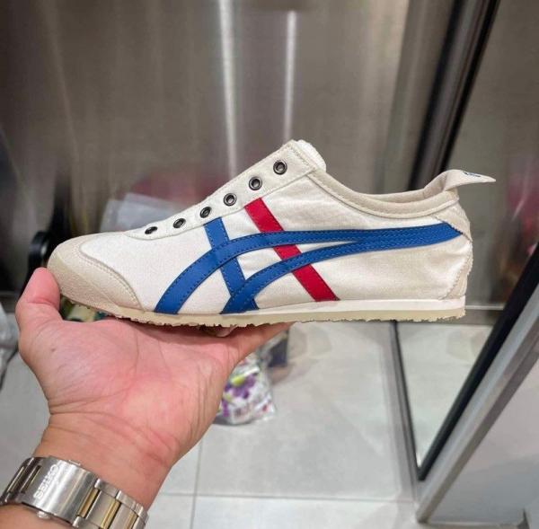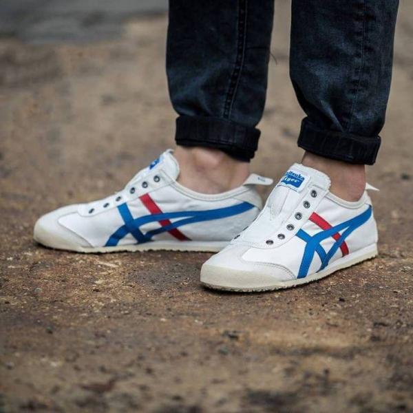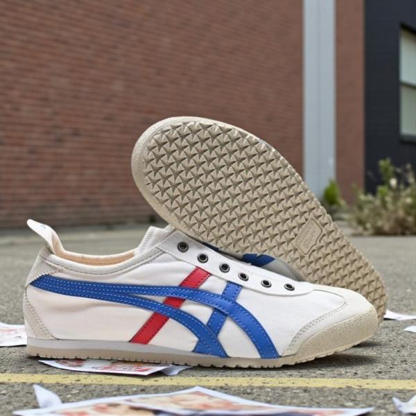 The Onitsuka Tiger Mexico 66 Slip-On in the classic "White/Blue/Red" tricolor is the most recognizable version of the brand's heritage silhouette. This 7A Master Quality (First Copy) replica for girls and women adapts the legendary 1966 racing design into a convenient, laceless sneaker. It features the signature cream-white base with vibrant blue and red Tiger stripes, making it a versatile staple that pairs effortlessly with everything from casual denim to summer dresses.